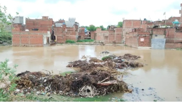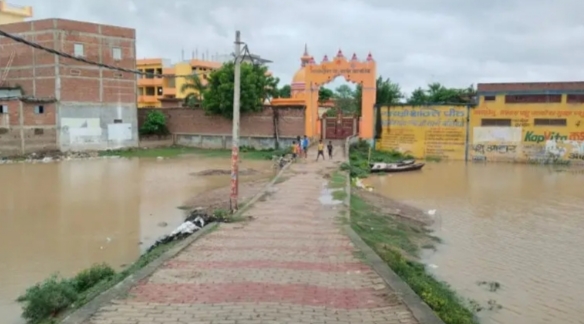 बलिया में गायत्री मंदिर के सामने पहुँचा बाढ़ का पानी