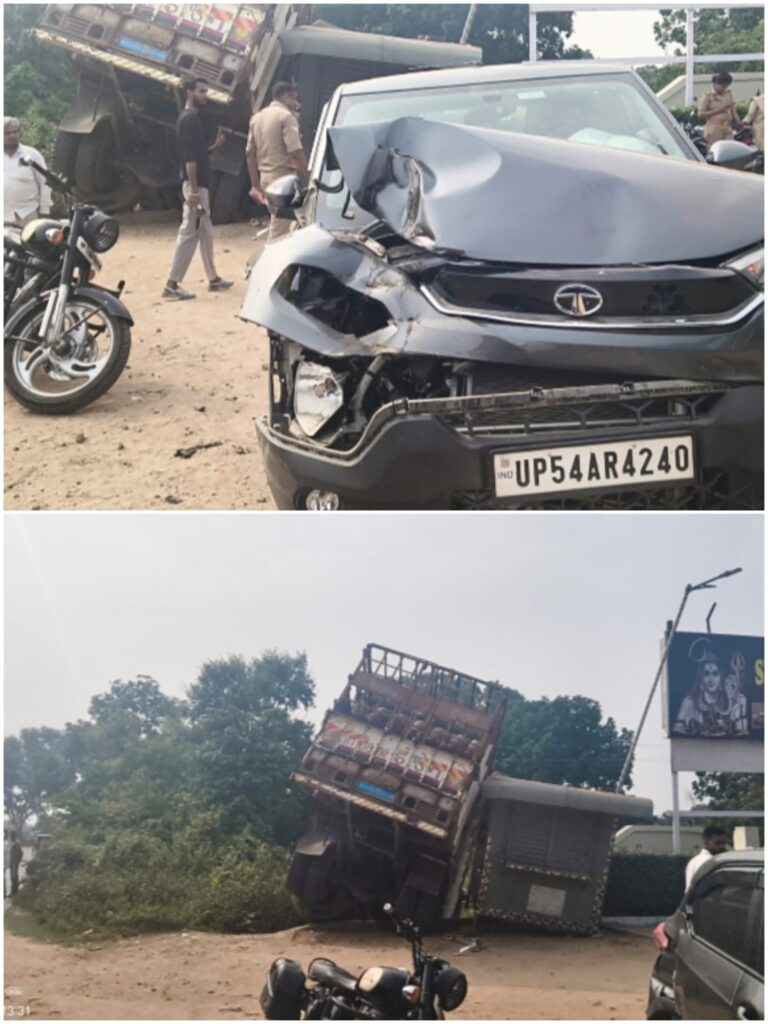 सिलेंडर लदे ट्रक ने खड़ी कार में मारी टक्कर, कार के परखच्चे उड़े, एक अधेड़ घायल