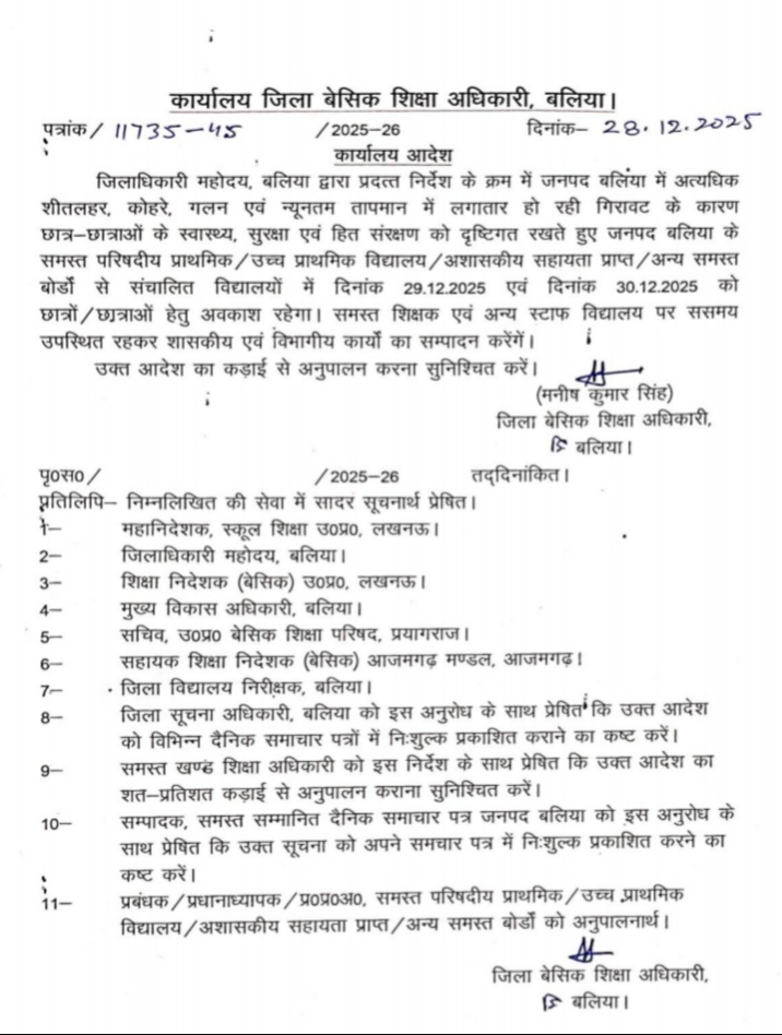 बलिया। जिलाधिकारी मंगला प्रसाद सिंह द्वारा जनपद बलिया में अत्यधिक शीतलहर, कोहरे, गलन एवं न्यूनतम तापमान में लगातार हो रही गिरावट के कारण छात्र-छात्राओं के स्वास्थ्य, सुरक्षा एवं हित संरक्षण को दृष्टिगत रखते हुए जनपद बलिया के समस्त परिषदीय प्राथमिक, उच्च प्राथमिक विद्यालय, अशासकीय सहायता प्राप्त व अन्य समस्त बोर्डों से संचालित विद्यालयों में दिनांक 29 एवं 30 दिसंबर 2025 को छात्रों – छात्राओं का अवकाश रहेगा। वहीं समस्त शिक्षक एवं अन्य स्टाफ विद्यालय पर समय से उपस्थित रहकर शासकीय एवं विभागीय कार्यों का सम्पादन करेंगें। जिला बेसिक शिक्षा अधिकारी मनीष कुमार सिंह ने समस्त विद्यालयों को आदेश का कड़ाई से अनुपालन करने का निर्देश दिया है।