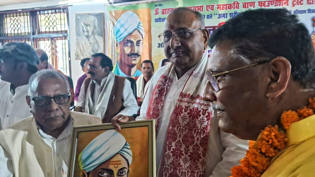 बलिया। प्रथम स्वतंत्रता संग्राम सेनानी एवं प्रथम शहीद मंगल पांडेय के बलिदान दिवस पर लखनऊ में आयोजित ॐ ब्राह्मण महासभा एवं महाकवि बाण फाउंडेशन ट्रस्ट द्वारा आयोजित श्रद्धांजलि सभा में बलिया जिले के मिड्ढा गांव निवासी एवं सेवानिवृत कर्मचारी/अधिकारी कल्याण समिति एवं सेवानिवृत शिक्षक,कर्मचारी/अधिकारी समन्वय समिति उत्तर प्रदेश के प्रदेश अध्यक्ष बरमेश्वर नाथ पांडेय को मंगल पांडेय की मोमेंटो देकर राष्ट्रीय कवि वेद व्रत बाजपेयी तथा ॐ ब्राह्मण महासभा के राष्ट्रीय अध्यक्ष धनंजय द्विवेदी ने संयुक्त रूप से सम्मानित किया। इसके अलावा 30 अन्य महिला व पुरुषों को भी सम्मानित किया गया। आपको बता दें कि यह सम्मान 8 अप्रैल 2024 को लखनऊ स्थित एक सभागार में आयोजित कार्यक्रम के दौरान दिया गया। इसकी जानकारी होने पर उनके शुभचिंतकों ने बधाई देते हुए उनके उज्जवल भविष्य की कामना की।