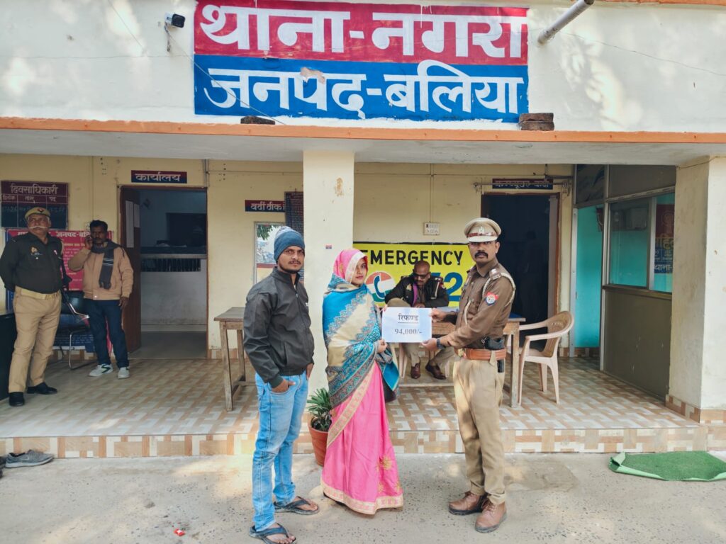 बलिया। नगरा थाना क्षेत्र में साइबर ठगी का शिकार हुई एक महिला को पुलिस की त्वरित कार्रवाई से बड़ी राहत मिली है। अज्ञात व्यक्ति द्वारा धोखाधड़ी कर खाते से निकाली गई 94 हजार रुपये शिकायतकर्ता के खाते में वापस करा दी गई।