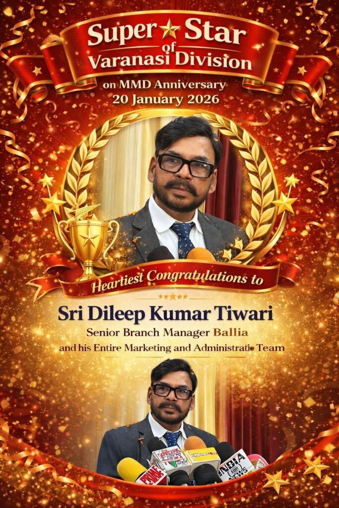 बलिया। 20 जनवरी 2026 को विश्व कीर्तिमान दिवस की प्रथम वर्षगाँठ पर भारतीय जीवन बीमा निगम शाखा बलिया अपने दोनों सम्पर्क कार्यालय चितबडागांव व रानिगंज समेत एक दिन में 897 पालिसिया पूर्ण करके पिछले वर्ष किए 699 पालिसियों का अपना ही रिकार्ड तोड़कर नया कीर्तिमान स्थापित किया। इस पर वरिष्ठ शाखा प्रबन्धक L.I.C बलिया दिलीप कुमार तिवारी ने इस उपलब्धि के लिए अपने शाखा प्रबन्धक (ए) सुरेन्द्र कुमार यादव, शाखा प्रबन्धक चितबड़ागांव श्रीराम प्रवेश राम, शाखा प्रबन्धक रानीगंज प्रशान्त कुमार पाण्डेय व सहायक शाखा प्रबंधक पंकज कुमार पाठक, कार्यालय के सभी सहयोगी, विकास अधिकारी, L.I.C एसोसिएट संवर्ग तथा मुख्य जीवन बीमा सलाहकार संवर्ग सहित सभी कर्मवीर अभिकर्ता साथियों तथा पालिसी धारको को हृदय से धन्यवाद ज्ञापित किया। बताया कि विकास वाहिनी से सीबी राय, अजय, आशीष कुमार सिंह, गिरीश चन्द्र गुप्ता, मो मंसूर आलम, बलराम तथा श्री प्रियम्बद कुमार दूबे जोनल टॉपर C.L.I.A का उल्लेखनीय योगदान रहा।