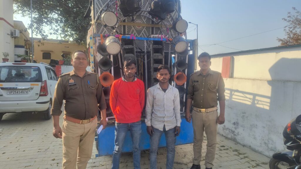 बरामदगी में पिकअप वाहन (UP60AT 0299), 5 डीजे साउंड, 4 हाईस, 4 पार लाइट, 2 लुंगी लाइट, 1 क्रॉसओवर, 1 डिवाइडर, 1 एम्पलीफायर, 1 हजारा, 1 मासपेड, 1 डीजे मिक्सर, 1 स्टेबलाइजर व 1 जनरेटर शामिल हैं।