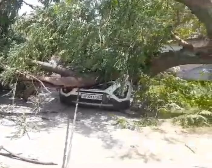 विधायक प्रतिनिधि की कार के उपर गिरा पेड़, बाल-बाल बचे
