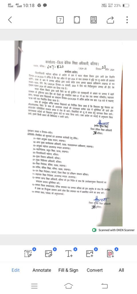 बलिया। मौसम विभाग द्वारा जारी बुलेटिन एवं एडवाइजरी के आधार व जनपद में बढ़ते तापमान के दृष्टिगत छात्र हित को देखते हुए कक्षा-01 से 08 तक के समस्त परिषदीय, सहायता प्राप्त, मान्यता प्राप्त विद्यालयों का संचालन 24 अप्रैल 2024 से अग्रिम आदेश तक प्रातः 7:30 बजे से मध्यान्ह 12:30 बजे तक निर्धारित कर दिया गया है। यह आदेश जिला बेसिक शिक्षा अधिकारी मनीष कुमार सिंह ने जिलाधिकारी के आदेश के क्रम में किया है।
