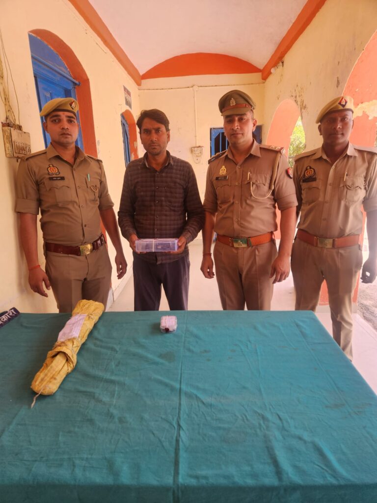 आरोपी का नाम विनोद चौबे पुत्र रामेश्वर चौबे निवासी ढेकवारी थाना नगरा है। शहर कोतवाली पुलिस को बीती रात मुखबिर से सूचना मिली कि तीखमपुर व राजीव नगर में कुछ दिन पहले चोरी की जो घटना घटित हुई थी, घटना करने वाले दो व्यक्ति मालगोदाम रेलवे स्टेशन के पास मौजूद हैं। तभी पुलिस मौके पर पहुंच गई और आरोपी विनोद चौबे को पकड़ लिया। जबकि इम्तियाज अहमद पुत्र गुलाम रसूल निवासी कस्बा सैदपुर थाना मुहम्मदाबाद अंधेरे का फायदा उठाकर भाग गया। आरोपी के पास से एक तमंचा, एक कारतुस बरामद हुआ।