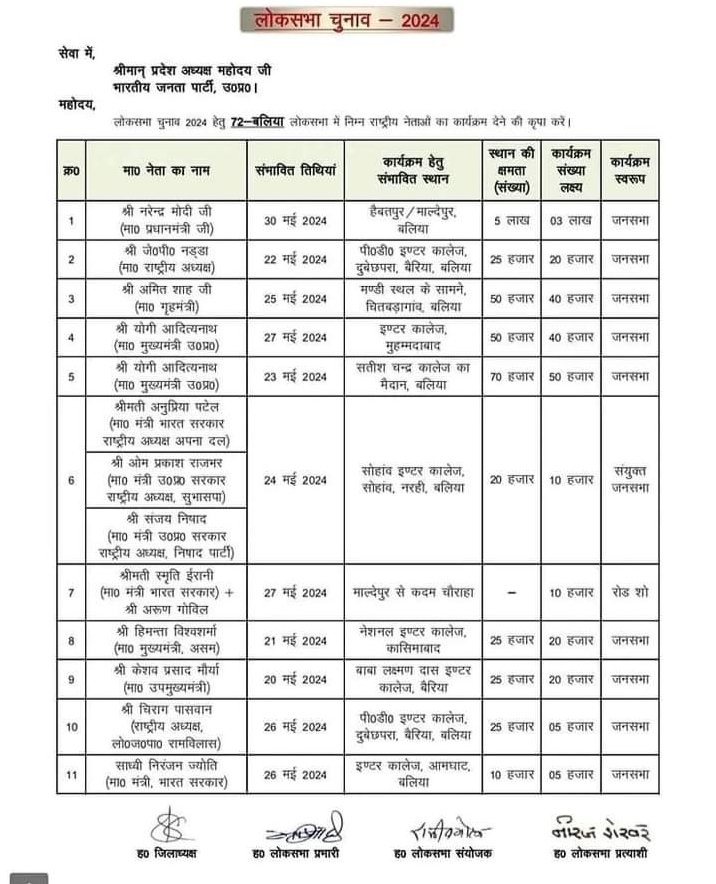 बलिया। लोकसभा चुनाव 2024 अंतर्गत 72 बलिया लोकसभा से भाजपा के उम्मीदवार नीरज शेखर के विभिन्न स्थानों पर आयोजित जनसभा को संबोधित करने के लिए राष्ट्रीय नेताओं की डिमांड भाजपा के जिलाध्यक्ष, लोकसभा प्रभारी, लोकसभा संयोजक एवं बलिया लोकसभा से भाजपा प्रत्याशी द्वारा भाजपा के प्रदेश अध्यक्ष से की गई है। जिसमें 30 मई को हैबतपुर बलिया में प्रधानमंत्री नरेंद्र मोदी के कार्यक्रम की डिमांड की गई है। इसी प्रकार 27 मई को बलिया लोकसभा अंतर्गत इंटर कॉलेज मोहम्मदाबाद में उत्तर प्रदेश के मुख्यमंत्री योगी आदित्य नाथ की मांग की गई है। इसके अलावा 27 मई को माल्देपुर से कदम चौराहा तक रोड शो के लिए भारत सरकार के मंत्री श्रीमती स्मृति ईरानी एवं अभिनेता अरुण गोविल की मांग की गई है। वही 26 मई को इंटर कॉलेज आमघाट बलिया में भारत सरकार के मंत्री साध्वी निरंजन ज्योति तथा पीडी इंटर कॉलेज दुबे छपरा बैरिया बलिया में लोजपा रामविलास पासवान के राष्ट्रीय अध्यक्ष चिराग पासवान की मांग जनसभा को संबोधित करने के लिए की गई है। जबकि 25 मई को मंडी स्थल के सामने चितबड़ागांव बलिया में गृह मंत्री अमित शाह की मांग जनसभा को संबोधित करने के लिए की गई है। इसी प्रकार 24 मई को सोहांव इंटर कॉलेज सोहांव नरही बलिया में भारत सरकार के मंत्री श्रीमती अनुप्रिया पटेल, उत्तर प्रदेश सरकार के मंत्री ओमप्रकाश राजभर तथा उत्तर प्रदेश सरकार के मंत्री संजय निषाद की मांग संयुक्त जनसभा को संबोधित करने के लिए की गई है। इसी क्रम में 23 मई को सतीश चंद्र कॉलेज बलिया के मैदान में मुख्यमंत्री योगी आदित्यनाथ की डिमांड जनसभा को संबोधित करने के लिए की गई है। वही 22 मई को पीडी इंटर कॉलेज दुबे छपरा बैरिया बलिया के मैदान में भाजपा के राष्ट्रीय अध्यक्ष जेपी नड्डा की मांग जनसभा को संबोधित करने के लिए की गई है। वही 21 मई को बलिया लोकसभा अंतर्गत नेशनल इंटर कॉलेज कासिमाबाद के मैदान में असम के मुख्यमंत्री हेमंत विश्वकर्मा की मांग जनसभा को संबोधित करने के लिए की गई है। इसी प्रकार 20 मई को बाबा लक्ष्मण दास इंटर कॉलेज बैरिया के मैदान में उत्तर प्रदेश के उपमुख्यमंत्री केशव प्रसाद मौर्य की मांग जनसभा को संबोधित करने के लिए की गई है। आपको बता दे कि 72 बलिया लोकसभा में 20 से लेकर 30 मई तक लगातार राष्ट्रीय नेताओं का आगमन होता नजर आ रहा है। बता दे की लोकसभा 2024 के सातवें चरण की अंतिम चुनाव मैं बलिया लोकसभा सीट जीतने के लिए भाजपा ने अपने तरकश से लगातार एक से बढ़कर एक बार छोड़ना शुरू कर दिया है। इसी क्रम में भाजपा ने राष्ट्रीय नेताओं की डिमांड जनसभा और रोड शो के लिए की है। ताकि बलिया से तीसरी बार जीत दर्ज कर हैट्रिक लगाया जा सके तो वहीं विपक्षी इंडिया गठबंधन के प्रत्याशी सनातन पांडेय एवं 
