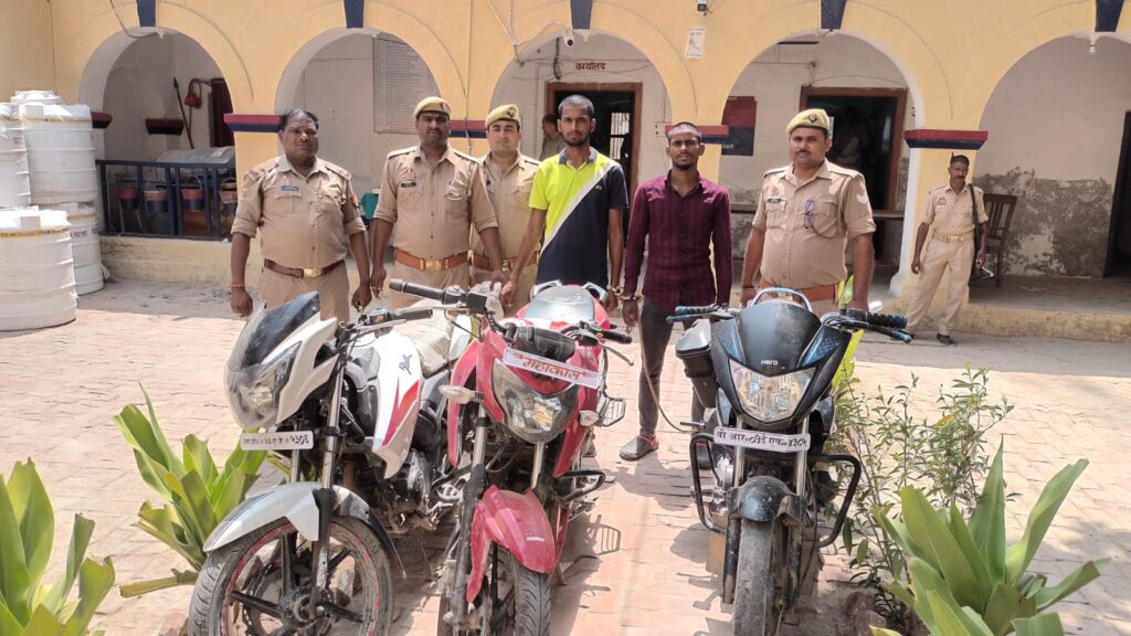 बलिया। अपराध एवं अपराधियों के खिलाफ चलाए जा रहे अभियान के क्रम में उभांव पुलिस ने चोरी की तीन बाइकों के साथ दो अभियुक्तों को गिरफ्तार कर न्यायालय भेज दिया। पूछताछ में अभियुक्तों ने अपना नाम व पता निखिल गुप्ता पुत्र मनोज कुमार गुप्ता निवासी बहादुरपुर कारी, थाना गड़वार, बलिया एवं सचिन कुमार राजभर पुत्र रामअवध राजभर निवासी खटया खडंगी थाना सिकन्दरपुर बलिया बताया।
