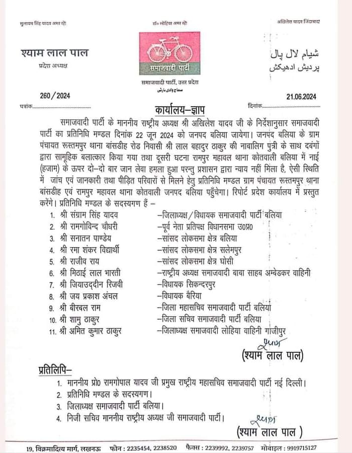 बलिया। समाजवादी पार्टी के राष्ट्रीय अध्यक्ष अखिलेश यादव के निर्देश पर समाजवादी पार्टी का प्रतिनिधि मण्डल 22 जून 2024 को जनपद बलिया जायेगा। जहां जनपद बलिया के ग्राम पंचायत रूस्तमपुर थाना बांसडीह रोड निवासी लाल बहादुर ठाकुर की नाबालिग पुत्री के साथ दबंगों द्वारा सामूहिक बलात्कार तथा रामपुर महावल थाना कोतवाली बलिया में नाई (हजाम) के ऊपर दो-दो बार जान लेवा हमला हुआ। लेकिन प्रशासन द्वारा न्याय नहीं मिला। जिसकी जांच व पीड़ित परिवारों से प्रतिनिधि मण्डल मिलकर रिपोर्ट प्रदेश कार्यालय को भेजेगा। प्रतिनिधि मण्डल के सदस्यगण इस प्रकार है।