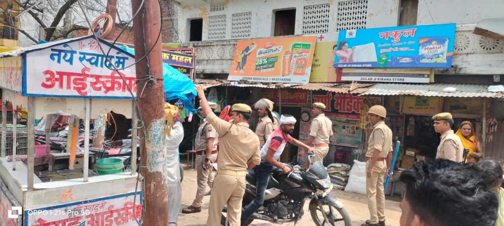 बलिया। क्षेत्राधिकारी के नेतृत्व में सुरक्षा की दृष्टि से कोतवाली तिराहे से बांसडीह चौराहे की समस्त दुकानों को बंद करा दिया गया। चप्पे—चप्पे पर पुलिस बल तैनात कर दिया गया है।