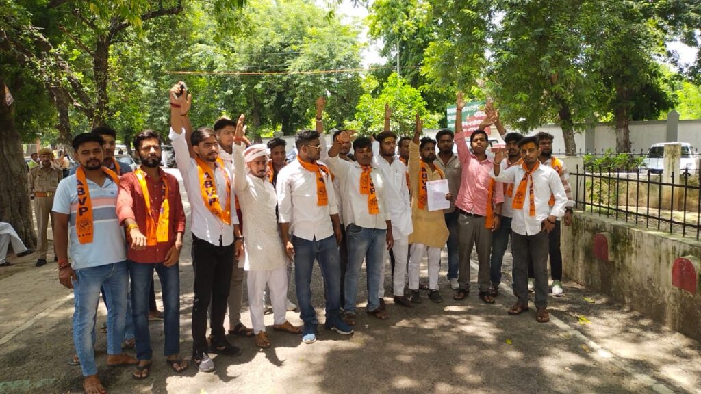 बलिया। छात्र संघ बहाल करने सहित तमाम मांगों को लेकर अखिल भारतीय विद्यार्थी परिषद के कार्यकर्ताओं ने सोमवार को कलेक्ट्रेट में प्रदर्शन किया। इस दौरान जिलाधिकारी को ज्ञापन सौंपा। ज्ञापन में मांग किया कि छात्र संघ बहाल किया जाए, विद्यालयों में जो वाहन चल रहे उनके मानक जैसे सीट, क्षमता, कागज एवं प्रदूषण की जांच हो। विश्वविद्यालय की दूरी को देखते हुए वाहन की व्यवस्था की जाए। शहर में स्थित चंद्रावली, रूद्रा, ग्रेंड सिंघानिया, पेप्सी जैसी होटलों की मानक जैसे पार्किंग, भोजन आदि की जांच की जाए।