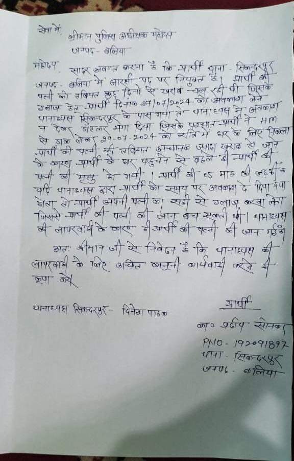 बलिया। सिकन्दरपुर थाने में तैनात सिपाही को थानाध्यक्ष द्वारा अवकाश नहीं दिए जाने के कारण उसकी पत्नी की मौत हो गई। पत्नी की असामयिक मौत और छह माह की पुत्री के सिर से मां का साया उठने से मर्माहत सिपाही का रो-रोकर बुरा हाल है।पीड़ित सिपाही ने थानाध्यक्ष के विरुद्ध कार्रवाई की मांग पत्र एसपी बलिया को सौंपा है जो सोशल मीडिया पर खूब वायरल हो रहा है।