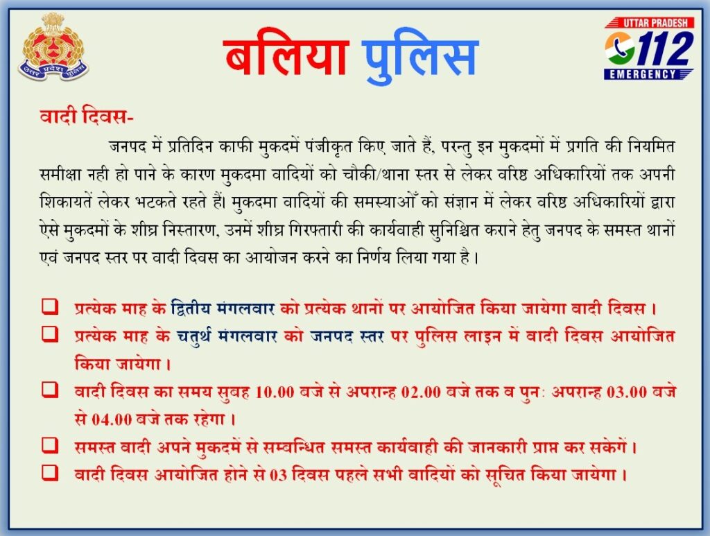 बलिया। नवागत पुलिस अधीक्षक विक्रांत वीर ने कानून व्यवस्था को चुस्त-दुरूस्त बनाने के उद्देश्य से मुकदमा वादियों के लिए वादी दिवस आयोजित करने का निर्णय लिया है। वादी दिवस प्रत्येक माह के द्वितीय मंगलवार को प्रत्येक थानों पर आयोजित किया जायेगा। जबकि प्रत्येक माह के चतुर्थ मंगलवार को जनपद स्तर पर पुलिस लाइन में वादी दिवस का आयोजन होगा। इसके लिए पूरा शेड्यूल जारी किया गया है।