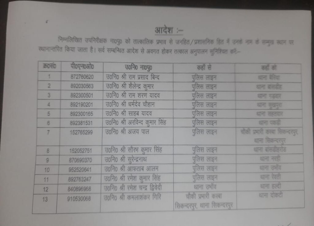 बलिया। जनपद में कानून व्यवस्था को चुस्त दुरुस्त बनाने के उद्देश्य से पुलिस अधीक्षक विक्रांत वीर ने रविवार की देर रात्रि 13 निरीक्षकों का कार्य क्षेत्र बदल कर नवीन स्थान पर तैनात होने का आदेश जारी किया है।