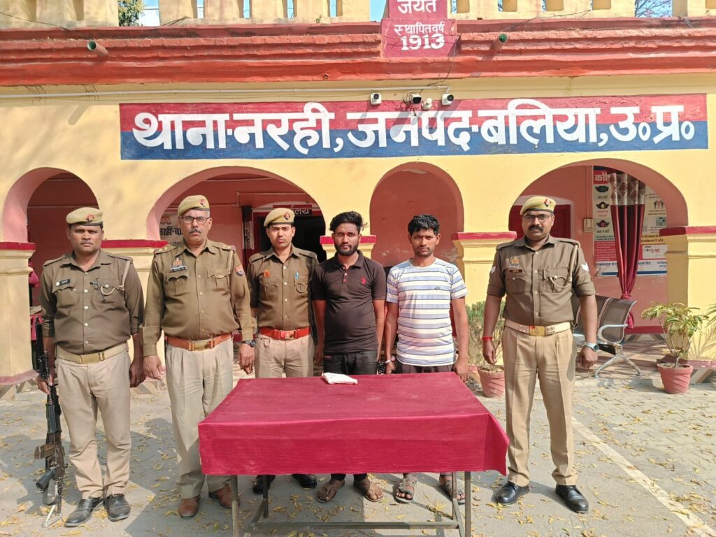 बलिया। अपराध एवं अपराधियों के विरूद्ध चलाये जा रहे अभियान के क्रम में सोमवार को नरही के उप निरीक्षक मंगला प्रसाद उपाध्याय ने मुखबिर की सूचना पर भरौली बार्डर के पास से अभियुक्त सिराजुद्दीन उर्फ सराजूल अहमद पुत्र बदरूद्दीन निवासी मानपुर थाना चितबड़ागाँव जनपद बलिया तथा सलीम पुत्र भुल्लू निवासी ग्राम मानपुर थाना चितबड़ागाँव जनपद बलिया को एक पिकअप वाहन में लदे 05 पशुओं के साथ गिरफ्तार किया। इसके अलावा अभियुक्त सलीम पुत्र भुल्लू निवासी ग्राम मानपुर थाना चितबड़ागाँव जनपद बलिया के कब्जे से एक अवैध तमंचा बरामद किया। गिरफ्तार अभियुक्तों के विरुद्ध थाना स्थानीय पर आवश्यक विधिक कार्यवाही करते हुए न्यायालय बलिया रवाना किया गया ।