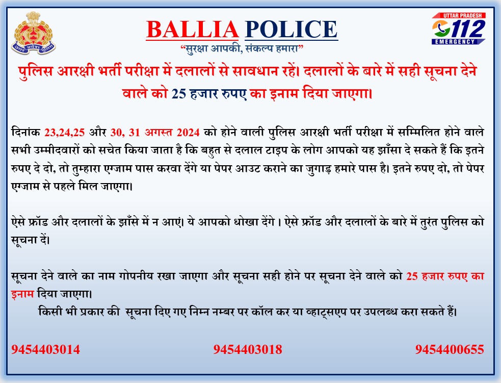 बलिया। पुलिस आरक्षी भर्ती परीक्षा को लेकर पुलिस महकमा पूरी तरह से गंभीर है। परीक्षा को सुचिता और शांति ढंग से संपन्न करने के लिए पुलिस ने एडवाइजरी जारी की है। जिसमें दलालों के बारे में सही सूचना देने वाले को 25 हजार रुपए इनाम देने की घोषणा की गई है। वहीं सूचना देने वाले का नाम गोपनीय रखा जाएगा।