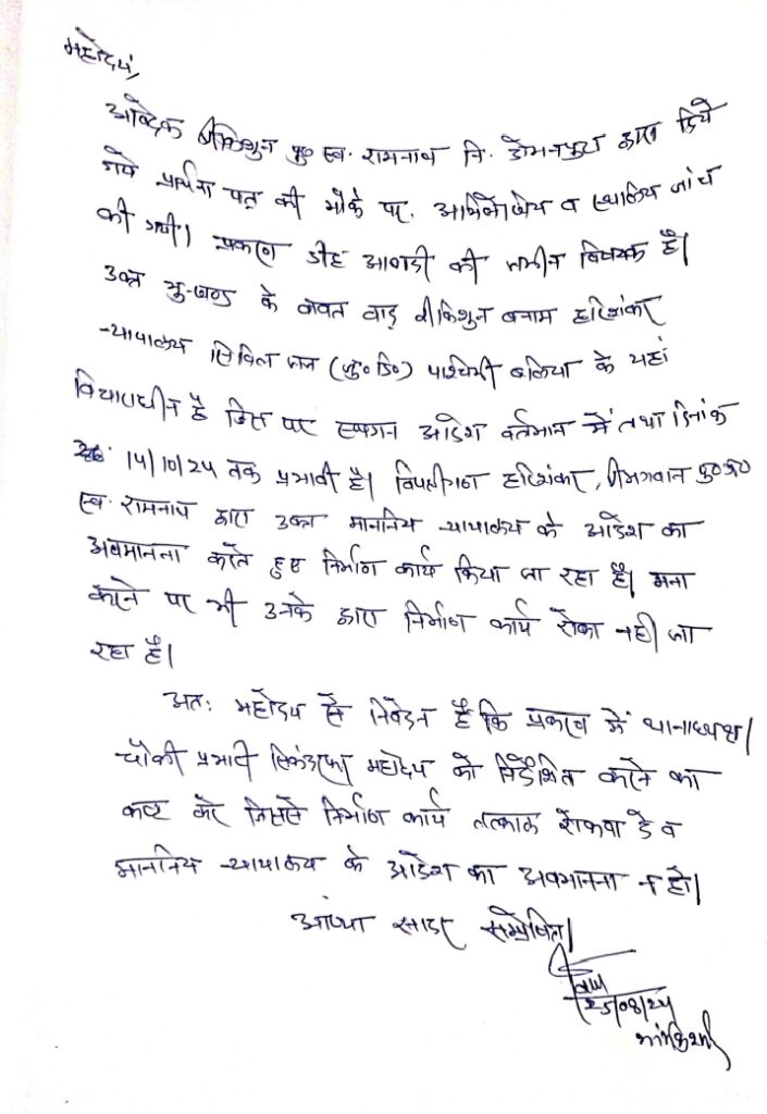 न्यायालय सिविल डिवीजन पाश्चिमी बलिया के यहां विचाराधीन है। जिस पर 14 अक्टूबर 2024 तक स्थगन आदेश प्रभावी है। बावजूद विपक्षी वर्तमान में न्यायालय के आदेश के अवमानना करते हुए जोर जबरदस्ती कर निर्माण कार्य करा रहा है। मना करने पर भी उनके द्वारा निर्माण कार्य रोका नही जा रहा है। निवेदन है कि प्रकरण में थानाध्यक्ष व चौकी प्रभारी सिकंदरपुर को निर्देशित करने का कष्ट करे। जिससे निर्माण कार्य तत्काल रोकवा सके और न्यायालय के आदेश का अवमानना न हो।