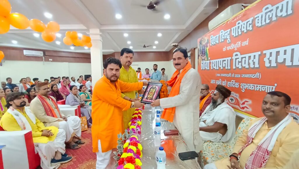 बलिया। हिन्दू मानबिन्दु, संस्कृति एवं परिवारों की रक्षा के लिए तत्पर प्रबल हिन्दुत्ववादी संगठन “विश्व हिन्दू परिषद” के 60 वें स्थापना दिवस “षष्ठीपूर्ति” वर्ष का आयोजन नगर स्थित अग्रवाल धर्मशाला में किया गया। कार्यक्रम का शुभारंभ दीप प्रज्ज्वलित एवं श्रीराम दरबार व भारत माता के चित्र पर पुष्पार्जन करके किया गया। इसके पश्चात जिला सत्संग प्रमुख संजेश तिवारी व बजरंग दल के जिला सह संयोजक सौमित्र पांडेय द्वारा मंचासीन महानुभावों का परिचय कराया गया। कार्यक्रम के प्रारंभ में बलिया के प्रसिद्ध गायक कृष्णा मिट्ठू ने अपने गीतों के माध्यम से सभी को मंत्रमुग्ध कर दिया।