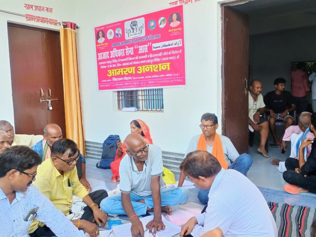 बता दे कि बेल्थरारोड तहसील अंतर्गत शाहपुर टिटिहा गांव में विगत तीन वर्षों से चकबंदी का कार्य चल रहा है। जिसमें चकबंदी विभाग के अधिकारियों द्वारा काश्तकारों का चक एक जगह करने के बजाय ताश की पत्तों की तरह छिन्न भिन्न कर दिया गया है। जिसको लेकर गांव के सिंहासन चौहान ने मुख्यमंत्री सहित चकबंदी आयुक्त को शिकायती पत्र के माध्यम से अवगत कराया। लेकिन मामला ठंडे बस्ते में चला गया। आलम यह है कि करीब तीन सौ किसानों ने चकबंदी न्यायालय में आपत्तियां दर्ज कराई है। इससे पूर्व 17 सितंबर 2022 को सिंहासन चौहान ने बेल्थरारोड तहसील पर बैठकर भ्रष्ट अधिकारियों के लिए चंदा इकट्ठा कर मुख्यमंत्री को भेजा। कहा कि अगर उनका अपने तनख्वाह से पेट नहीं भरता है तो उन भ्रष्ट अधिकारियों को दे दिया जाए। इसके बाद भी चकबंदी विभाग के अधिकारियों का लूटपाट चलता रहा। जिसकी शिकायत हमने जिलाधिकारी सहित विभागीय उच्च अधिकारियों से किया। लेकिन मेरे आवेदन पर गलत रिपोर्ट लगाकर मामले को ठंडा बस्ते में डाल दिया जाता था। इसके बाद मैंने ग्यारह सूत्रीय मांगों को लेकर आमरण अनशन करने का फैसला लिया। एसीओ एसपी यादव, कानूनगो महेंद्र राम, लेखपाल विजय मौर्य, रविन्द्र सिंह यादव आदि लोग मौजूद रहे।