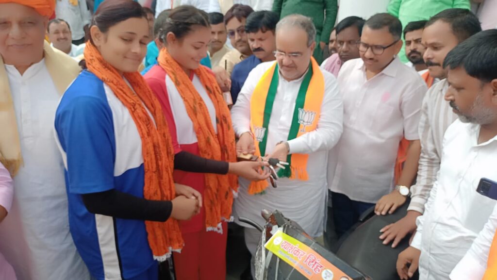 भाजपा के प्रदेश अध्यक्ष के हाथों स्कूटी पाकर दोनों बहनों के खिले चेहरे, जताया आभार