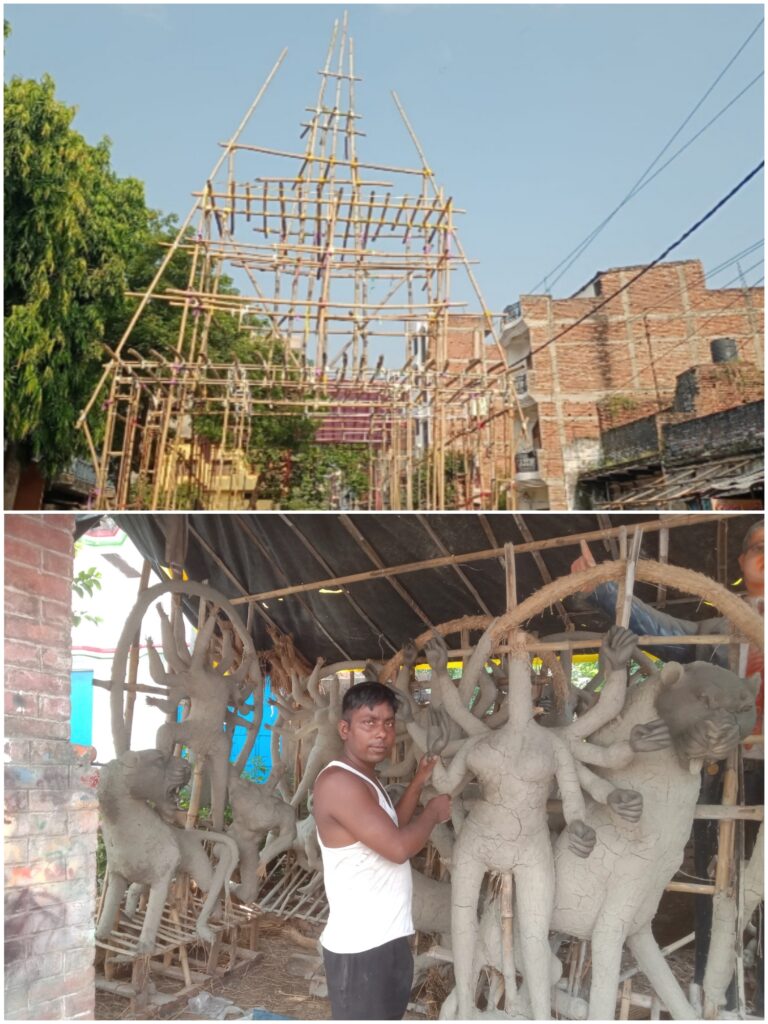 अधिकांश पंडालों का निर्माण कर रहे समिति के युवक