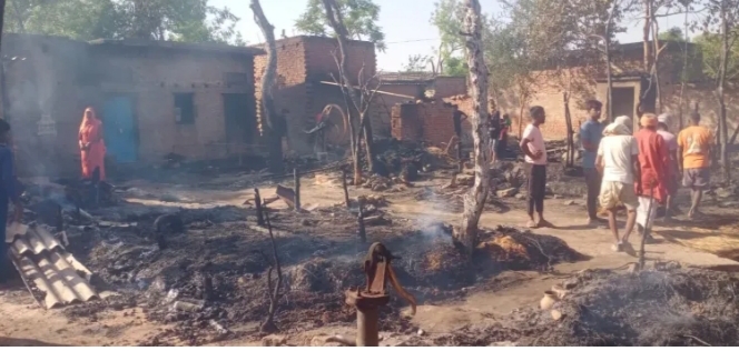 आग से दो दर्जन झोपड़ियां व सामान राख, एक भैंस झुलसी