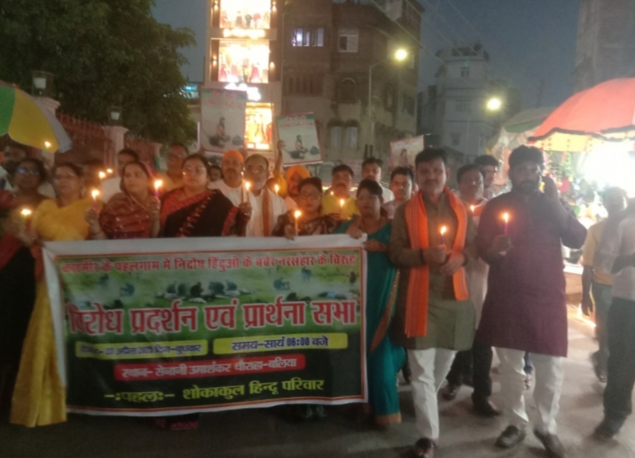 नगर के शहीद चौक से भाजपा एवं फेडरेशन आफ आल इंडिया व्यापार मंडल बलिया के संयुक्त तत्वावधान में बुधवार की शाम शहीद चौक से कैंडल मार्च निकालकर नगर के विभिन्न मार्ग होते हुए ओक्डेनगंज चौराहा स्थित सेनानी उमाशंकर की प्रतिमा के समक्ष कैंडल रखा। आतंकवाद मुर्दाबाद, शांति जिंदाबाद के नारे लगाए। इस मौके पर भाजपा जिलाध्यक्ष संजय मिश्रा, सोनी तिवारी, अरूण सिंह बंटू, अभिजीत सिंह अंकुर, अशोक गुप्ता, अरविंद गांधी, घनश्याम दास जौहरी, रजनी कांत सिंह, टुनटुन सराफ,मंजय सिंह, आकाश पटेल समेत दर्जनों लोग मौजूद रहे। उधर, यूपीएमएसआरए बलिया इकाई के तत्वावधान में दवा प्रतिनिधियों ने जम्मू-कश्मीर के पहलगाम में पर्यटकों की निर्मम तरीके से की गई हत्या के विरोध में शहीद पार्क चौक बलिया से शाम को कैंडल मार्च निकाला। कैंडल मार्च शहीद चौक से निकलकर नगर के विभिन्न मार्ग होते हुए शहीद चौक पर पहुंचा, जहां गांधीजी के प्रतिमा के समक्ष कैंडल रख मरे लोगों के प्रति श्रद्धांजलि अर्पित किया। इस अवसर पर यूपीएमएसआरए के महामंत्री आलोक मिश्रा एवं मनोज श्रीवास्तव ने कहाकि आतंकवादियों का यह बहुत ही कायरनामा हरकत है। इसका मुंहतोड़ जवाब दिया जाना चाहिए। इस मौके पर कमलेश, अखिलेश, राकेश, देवेंद्र राय , सौरभ माथुर, अजीत, छोटन शर्मा आदि रहे।